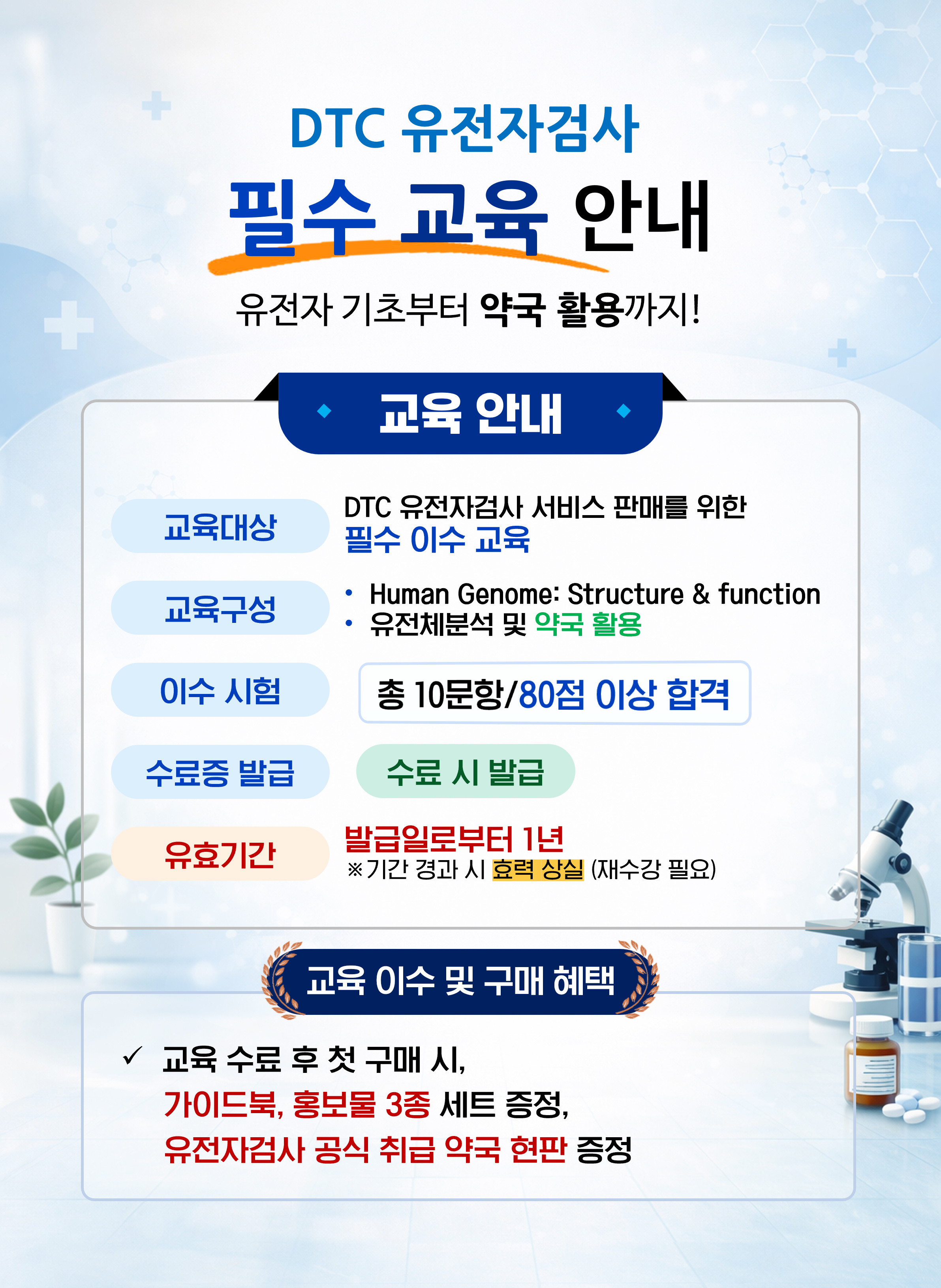 해당 교육을 이수하신 약사님에 한하여 DTC 유전자검사 서비스 판매가 가능합니다.