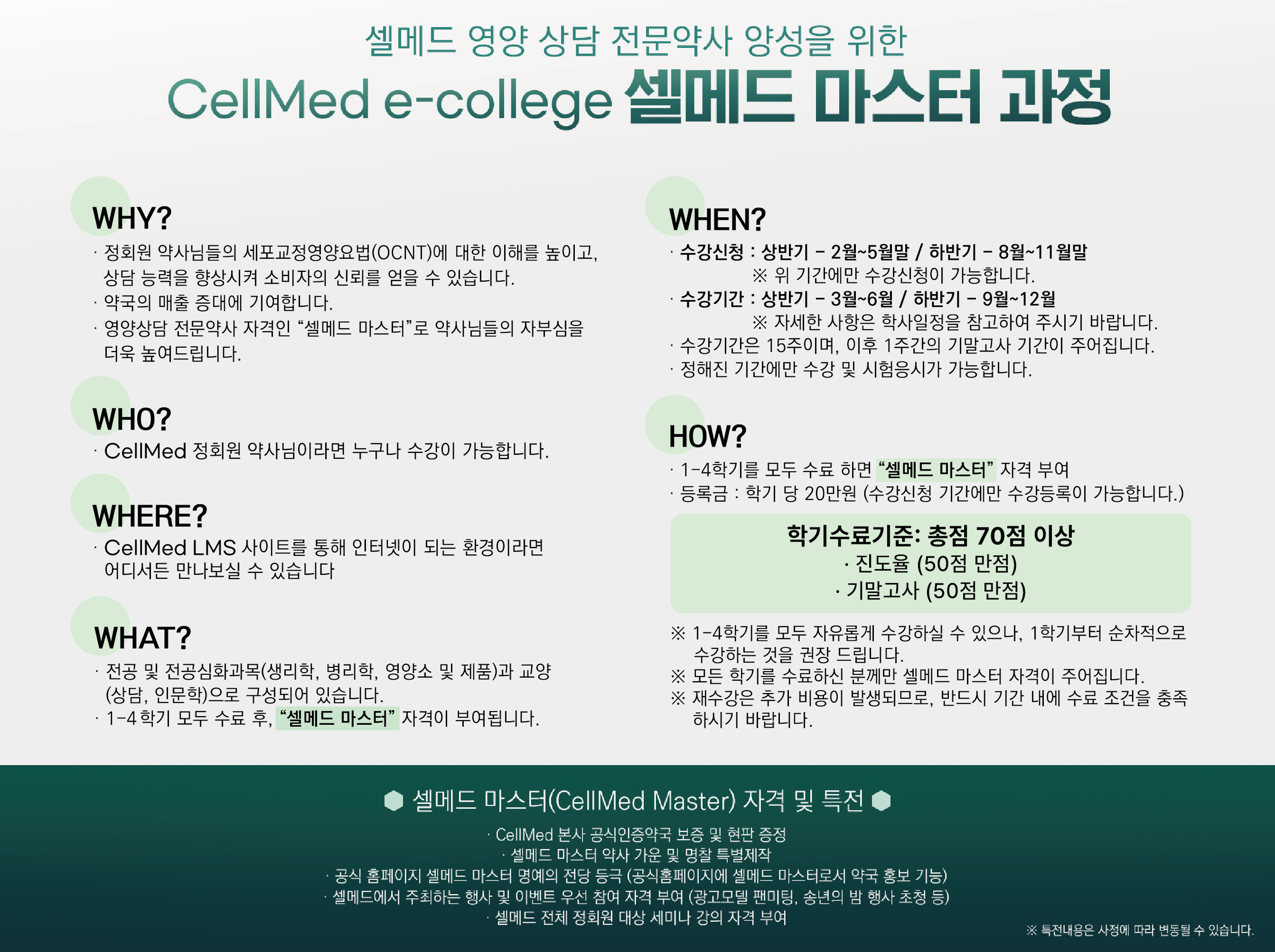 e-college 정규과정은 '셀메드 마스터' 자격을 취득할 수 있는 4학기 과정으로 구성되어 있습니다.